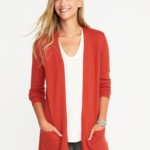 I purchased this orange open front cardigan from Old Navy, and as you can see, it also adds a pop of color to my look. I intentionally wore the same base outfit for each of these pictures so that it would be easy to see how the whole look changes when you trade out the sweater. This knit is not ribbed, and it doesn’t have the collar detail of the first one. Because this knit is smooth, I think it could lend itself to going with a dressier outfit if you needed it to, whereas the ribbed plum one reads more casual to me.